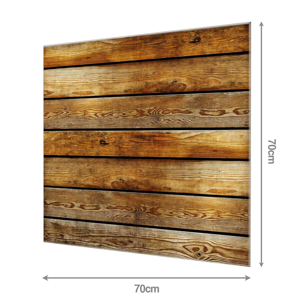 Material: 4mm Sicherheitsglas mit Metallrückwand Eigenschaften: beschreibbar, magnetisch, kratzfest Maße: 70x70x0,6cm, 10,50 kg schwer Motiv Nummer 10056 Holzbretter Zubehör: inklusive 4 Neodym-Magnete