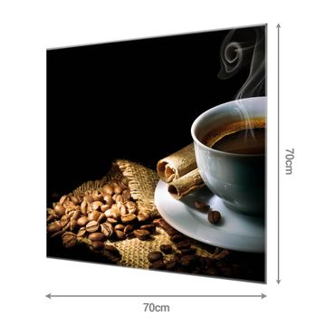 Material: 4mm Sicherheitsglas mit Metallrückwand Eigenschaften: beschreibbar, magnetisch, kratzfest Maße: 70x70x0,6cm, 10,50 kg schwer Motiv Nummer 10176 Hot Coffee Zubehör: inklusive 4 Neodym-Magnete