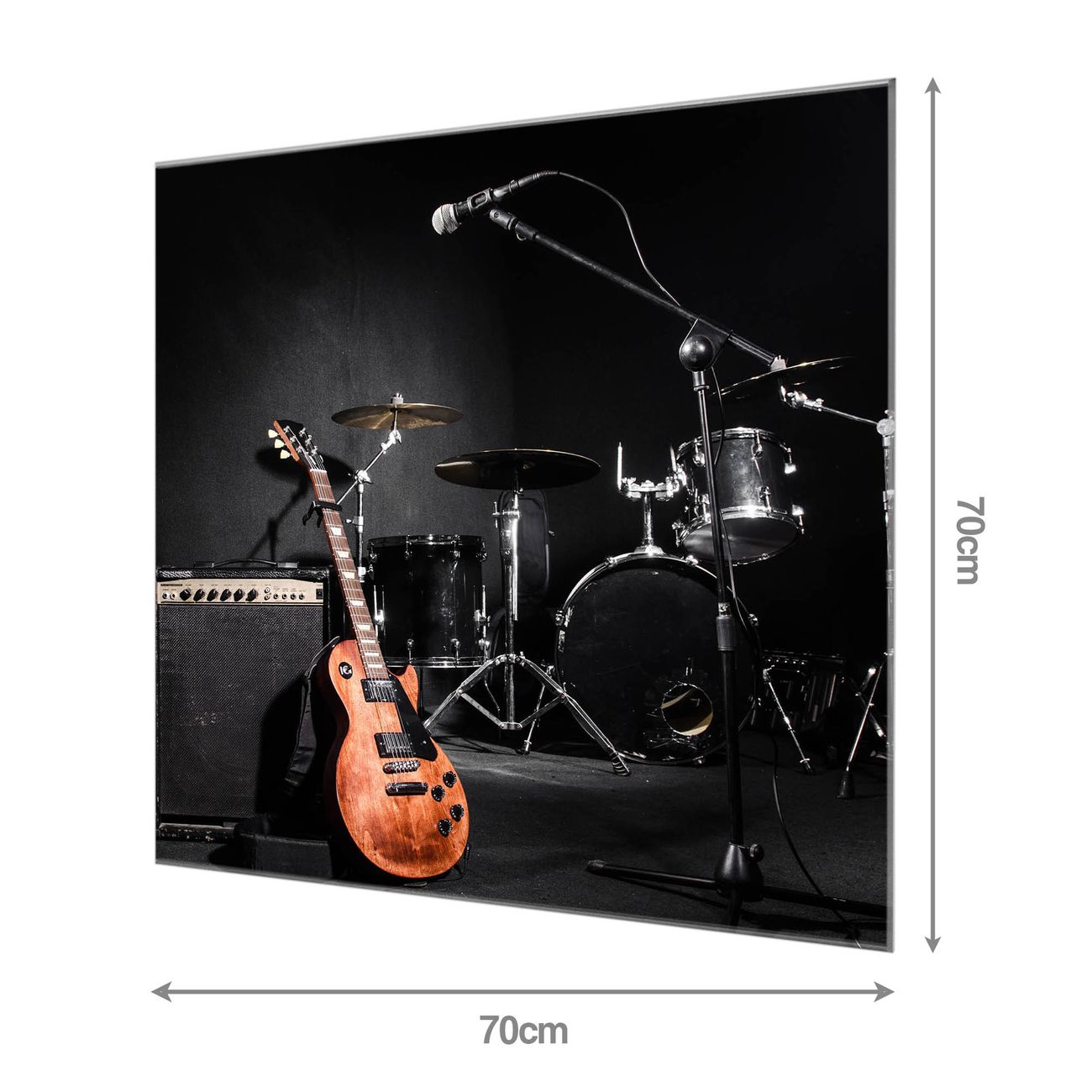 Material: 4mm Sicherheitsglas mit Metallrückwand Eigenschaften: beschreibbar, magnetisch, kratzfest Maße: 70x70x0,6cm, 10,50 kg schwer Motiv Nummer 11224 Jam Session Zubehör: inklusive 4 Neodym-Magnete