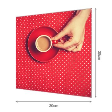 Material: 4mm Sicherheitsglas mit Metallrückwand Eigenschaften: beschreibbar, magnetisch, kratzfest Maße: 30x30x0,6cm, 1,89 kg schwer Motiv Nummer 12479 Kaffee Rot Weiss Zubehör: inklusive 4 Neodym-Magnete