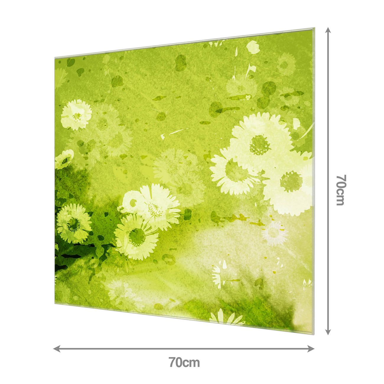 Material: 4mm Sicherheitsglas mit Metallrückwand Eigenschaften: beschreibbar, magnetisch, kratzfest Maße: 70x70x0,6cm, 10,50 kg schwer Motiv Nummer 10390 Kamille Grün Zubehör: inklusive 4 Neodym-Magnete