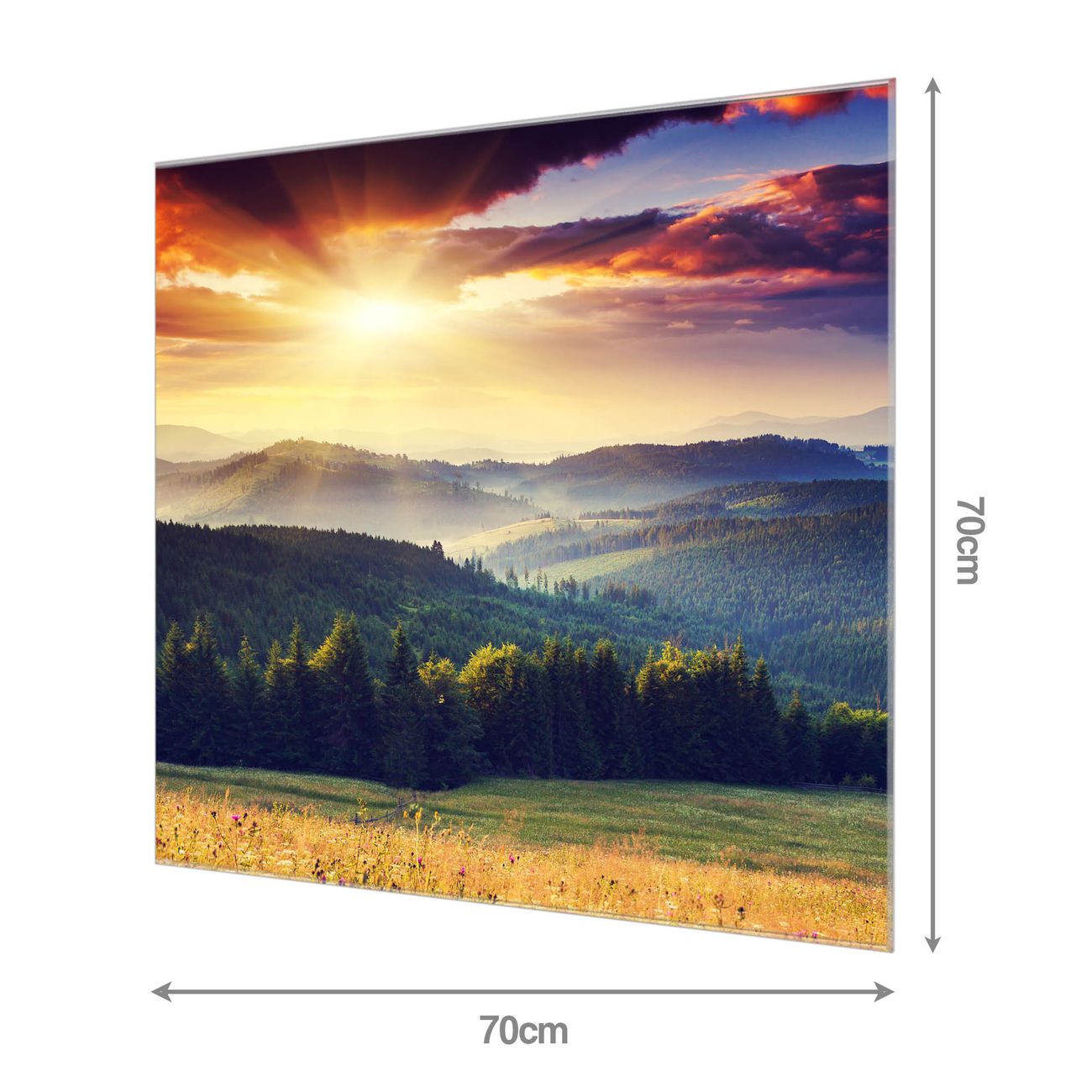 Material: 4mm Sicherheitsglas mit Metallrückwand Eigenschaften: beschreibbar, magnetisch, kratzfest Maße: 70x70x0,6cm, 10,50 kg schwer Motiv Nummer 12313 Karpaten Sonnenuntergang Zubehör: inklusive 4 Neodym-Magnete