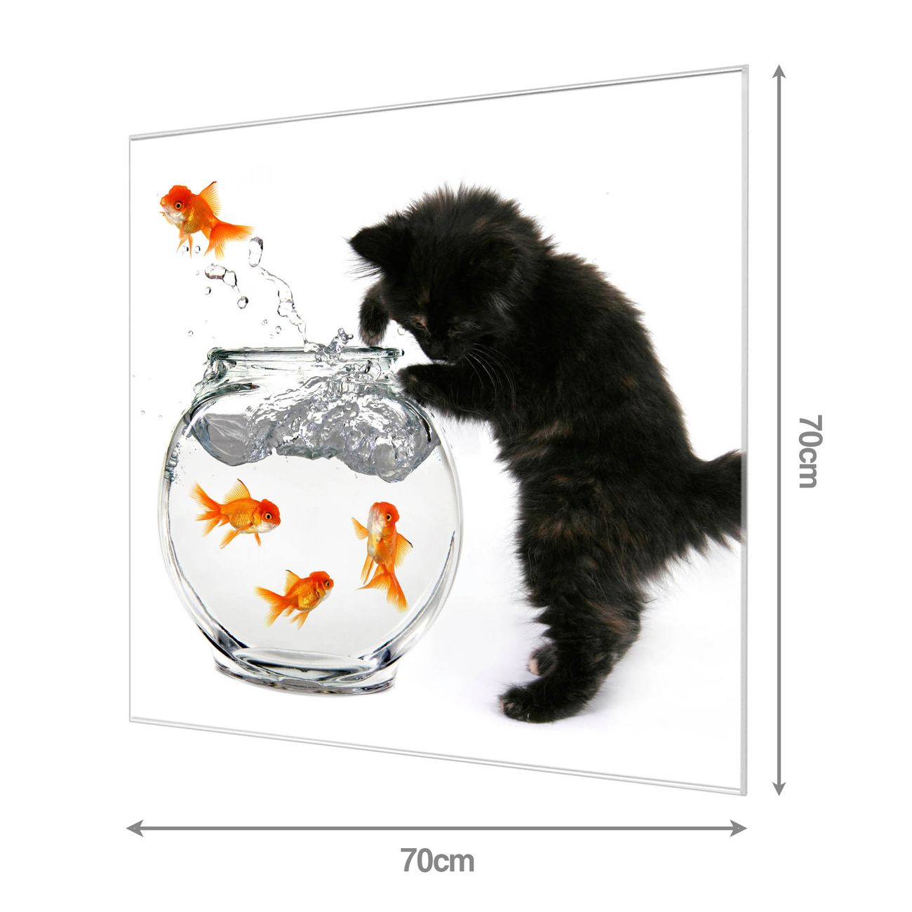 Material: 4mm Sicherheitsglas mit Metallrückwand Eigenschaften: beschreibbar, magnetisch, kratzfest Maße: 70x70x0,6cm, 10,50 kg schwer Motiv Nummer 12355 Katze Und Fisch Zubehör: inklusive 4 Neodym-Magnete