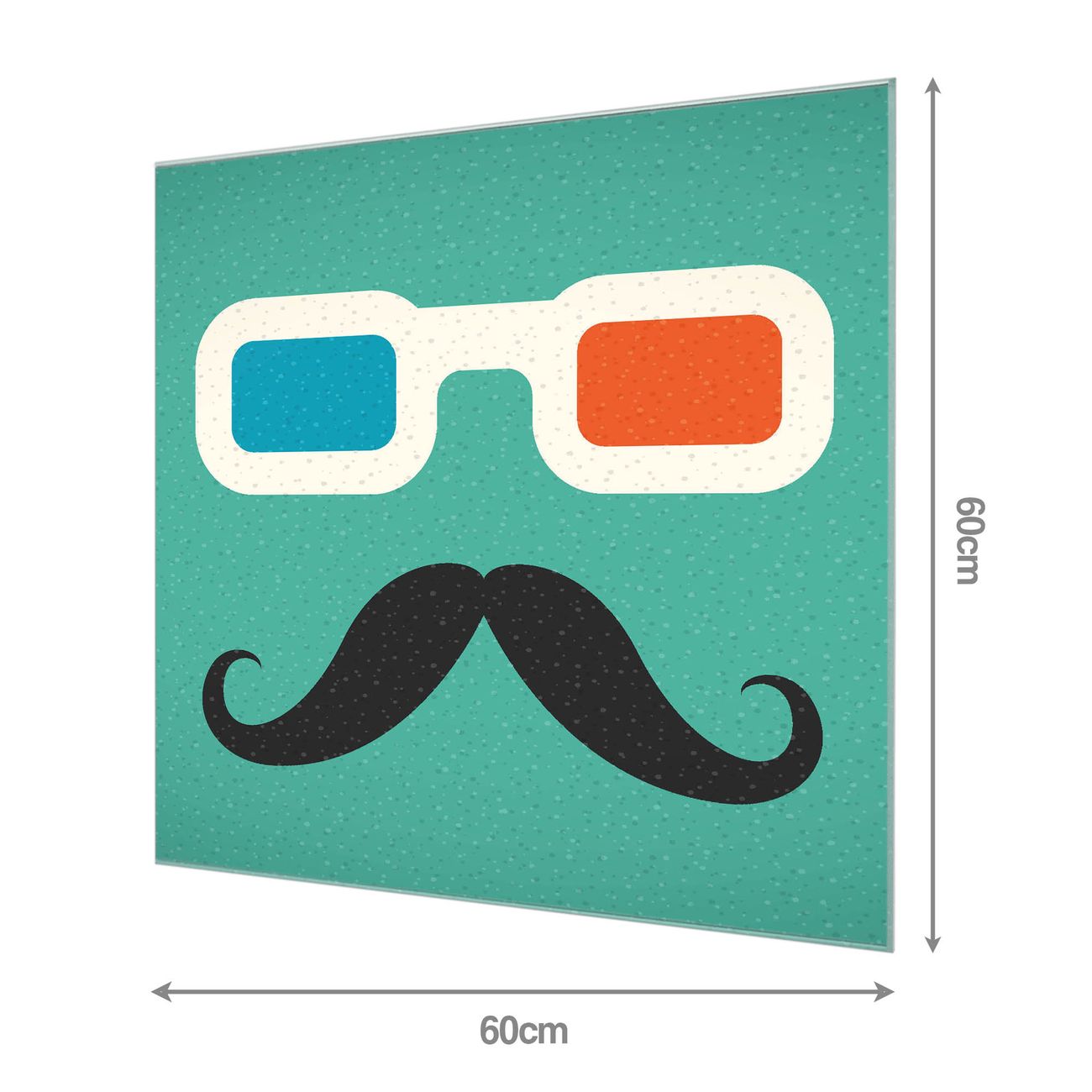 Material: 4mm Sicherheitsglas mit Metallrückwand Eigenschaften: beschreibbar, magnetisch, kratzfest Maße: 60x60x0,6cm, 7,56 kg schwer Motiv Nummer 12500 Kinobrille Zubehör: inklusive 4 Neodym-Magnete