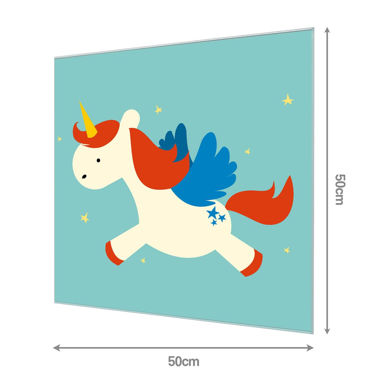 Material: 4mm Sicherheitsglas mit Metallrückwand Eigenschaften: beschreibbar, magnetisch, kratzfest Maße: 50x50x0,6cm, 5,25 kg schwer Motiv Nummer 11904 Kleines Einhorn Zubehör: inklusive 4 Neodym-Magnete
