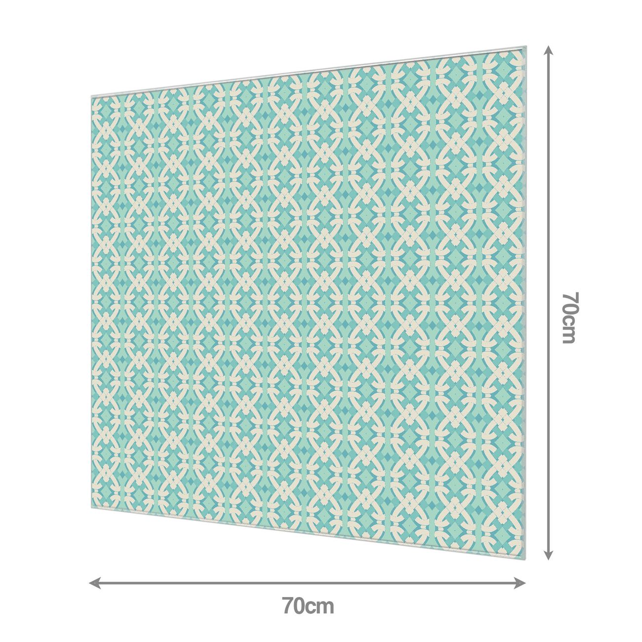 Material: 4mm Sicherheitsglas mit Metallrückwand Eigenschaften: beschreibbar, magnetisch, kratzfest Maße: 70x70x0,6cm, 10,50 kg schwer Motiv Nummer 11872 Knoten Türkis Zubehör: inklusive 4 Neodym-Magnete