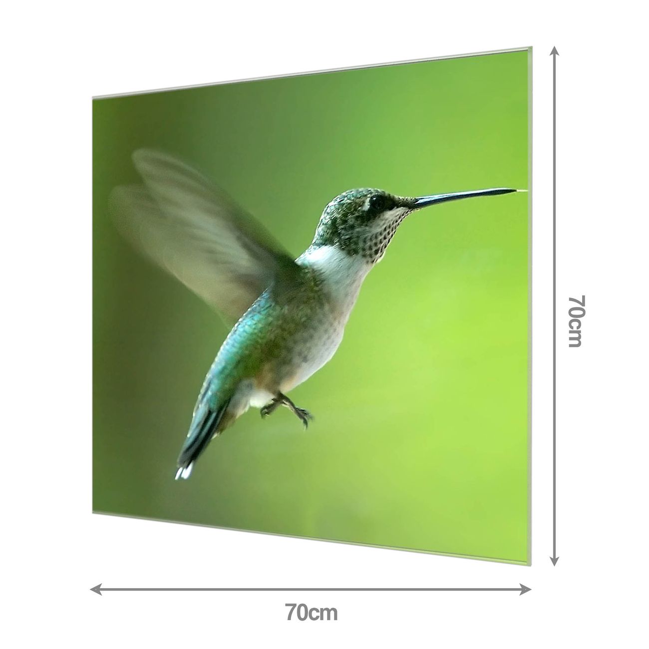 Material: 4mm Sicherheitsglas mit Metallrückwand Eigenschaften: beschreibbar, magnetisch, kratzfest Maße: 70x70x0,6cm, 10,50 kg schwer Motiv Nummer 10103 Kolibri Zubehör: inklusive 4 Neodym-Magnete