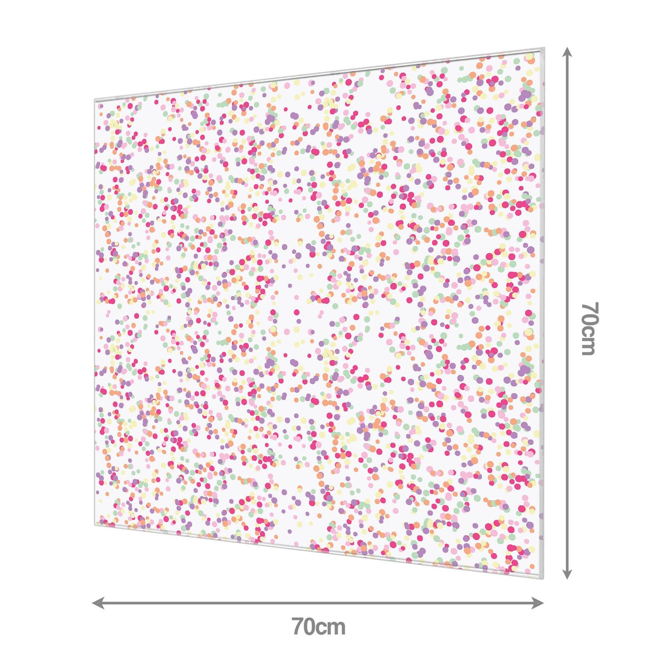 Material: 4mm Sicherheitsglas mit Metallrückwand Eigenschaften: beschreibbar, magnetisch, kratzfest Maße: 70x70x0,6cm, 10,50 kg schwer Motiv Nummer 11122 Konfettiregen Zubehör: inklusive 4 Neodym-Magnete