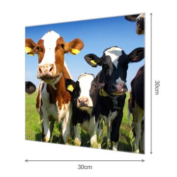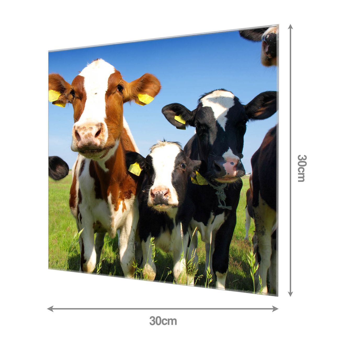 Material: 4mm Sicherheitsglas mit Metallrückwand Eigenschaften: beschreibbar, magnetisch, kratzfest Maße: 30x30x0,6cm, 1,89 kg schwer Motiv Nummer 10225 Kühe Zubehör: inklusive 4 Neodym-Magnete