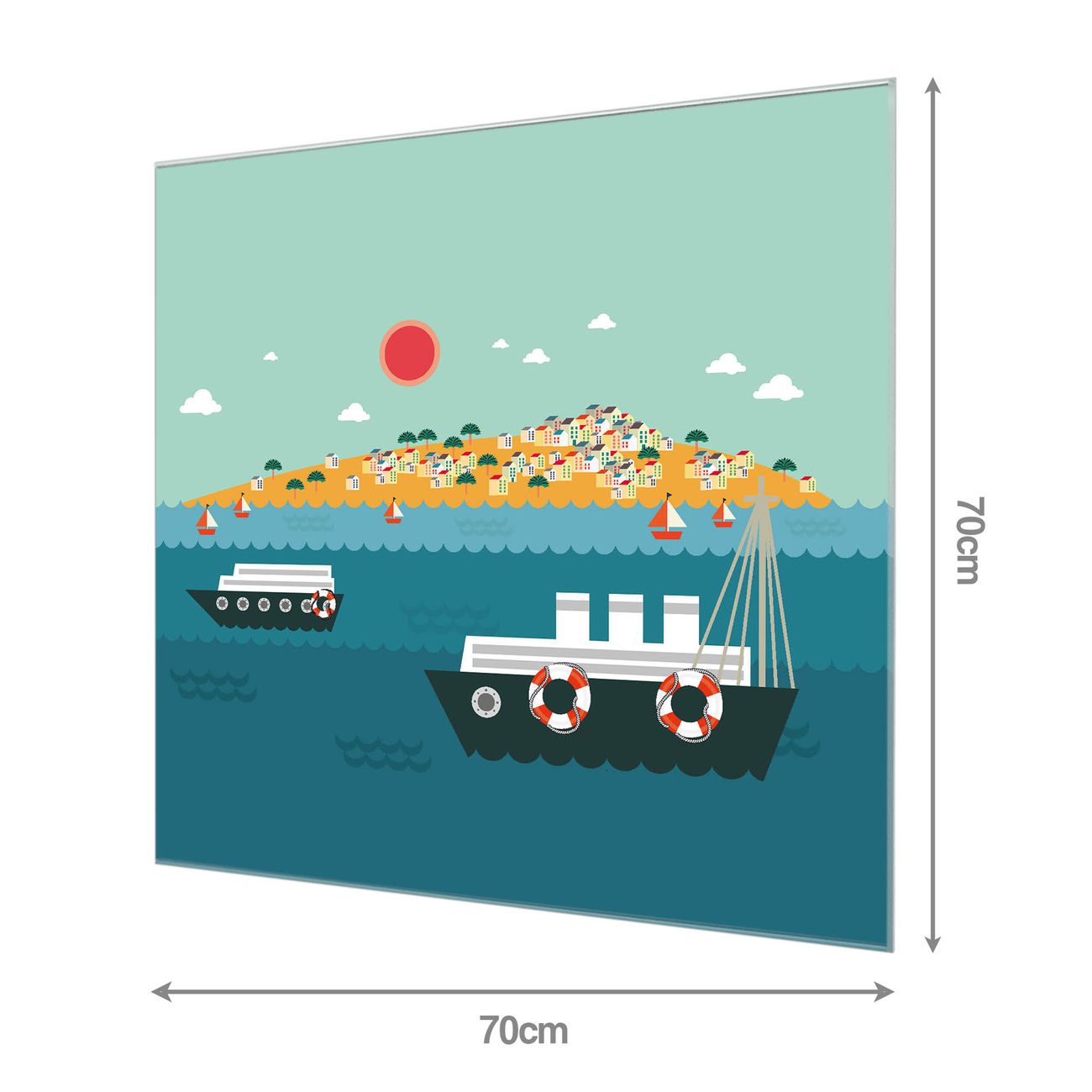Material: 4mm Sicherheitsglas mit Metallrückwand Eigenschaften: beschreibbar, magnetisch, kratzfest Maße: 70x70x0,6cm, 10,50 kg schwer Motiv Nummer 11921 Land in Sicht Zubehör: inklusive 4 Neodym-Magnete
