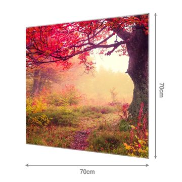 Material: 4mm Sicherheitsglas mit Metallrückwand Eigenschaften: beschreibbar, magnetisch, kratzfest Maße: 70x70x0,6cm, 10,50 kg schwer Motiv Nummer 11177 Lichtung Im Herbst Zubehör: inklusive 4 Neodym-Magnete