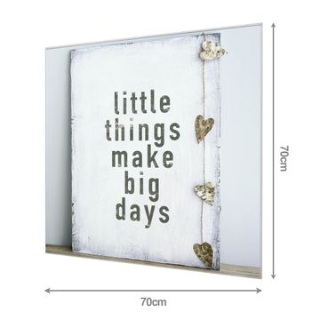 Material: 4mm Sicherheitsglas mit Metallrückwand Eigenschaften: beschreibbar, magnetisch, kratzfest Maße: 70x70x0,6cm, 10,50 kg schwer Motiv Nummer 12708 Little Things Zubehör: inklusive 4 Neodym-Magnete