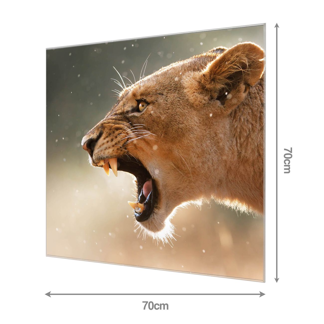 Material: 4mm Sicherheitsglas mit Metallrückwand Eigenschaften: beschreibbar, magnetisch, kratzfest Maße: 70x70x0,6cm, 10,50 kg schwer Motiv Nummer 12360 Löwin Zubehör: inklusive 4 Neodym-Magnete