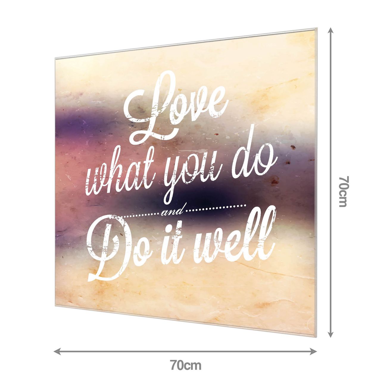 Material: 4mm Sicherheitsglas mit Metallrückwand Eigenschaften: beschreibbar, magnetisch, kratzfest Maße: 70x70x0,6cm, 10,50 kg schwer Motiv Nummer 12771 Love What You Do Zubehör: inklusive 4 Neodym-Magnete