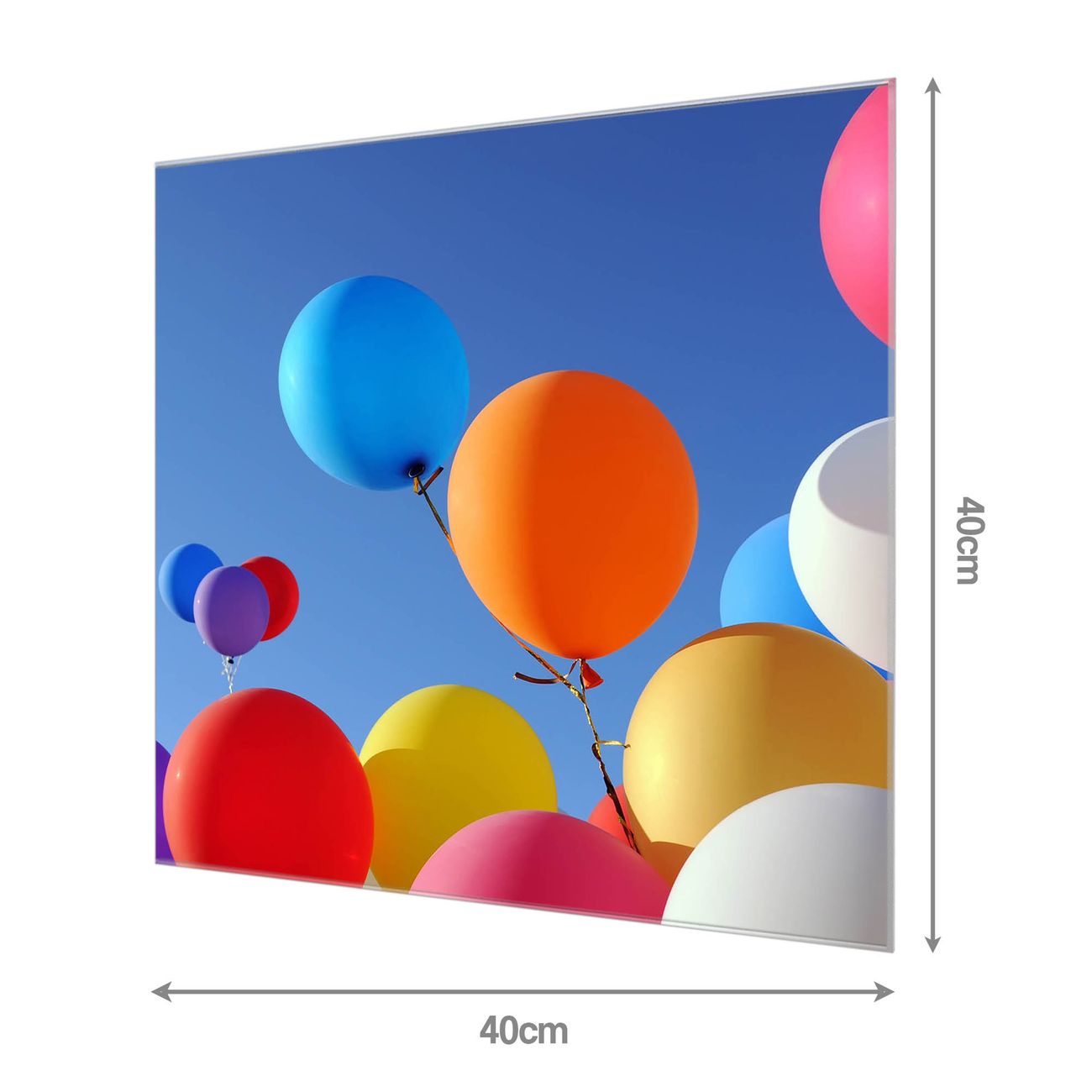 Material: 4mm Sicherheitsglas mit Metallrückwand Eigenschaften: beschreibbar, magnetisch, kratzfest Maße: 40x40x0,6cm, 3,36 kg schwer Motiv Nummer 10276 Luftballons Zubehör: inklusive 4 Neodym-Magnete