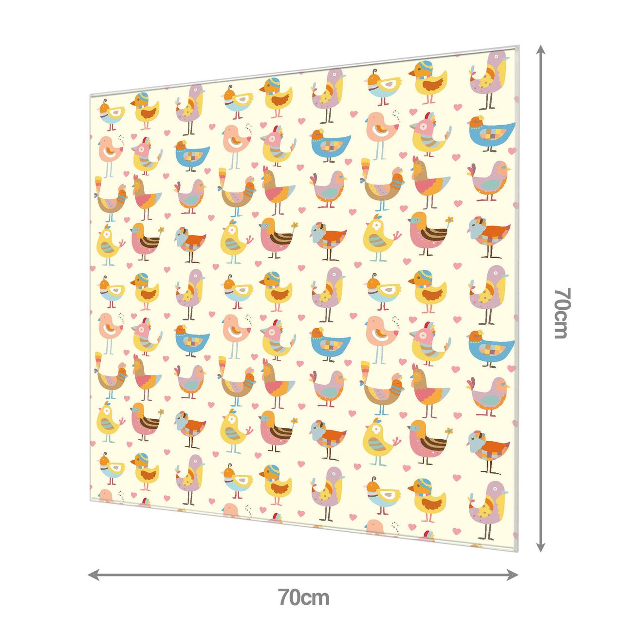 Material: 4mm Sicherheitsglas mit Metallrückwand Eigenschaften: beschreibbar, magnetisch, kratzfest Maße: 70x70x0,6cm, 10,50 kg schwer Motiv Nummer 11543 Lustige Vögel Zubehör: inklusive 4 Neodym-Magnete