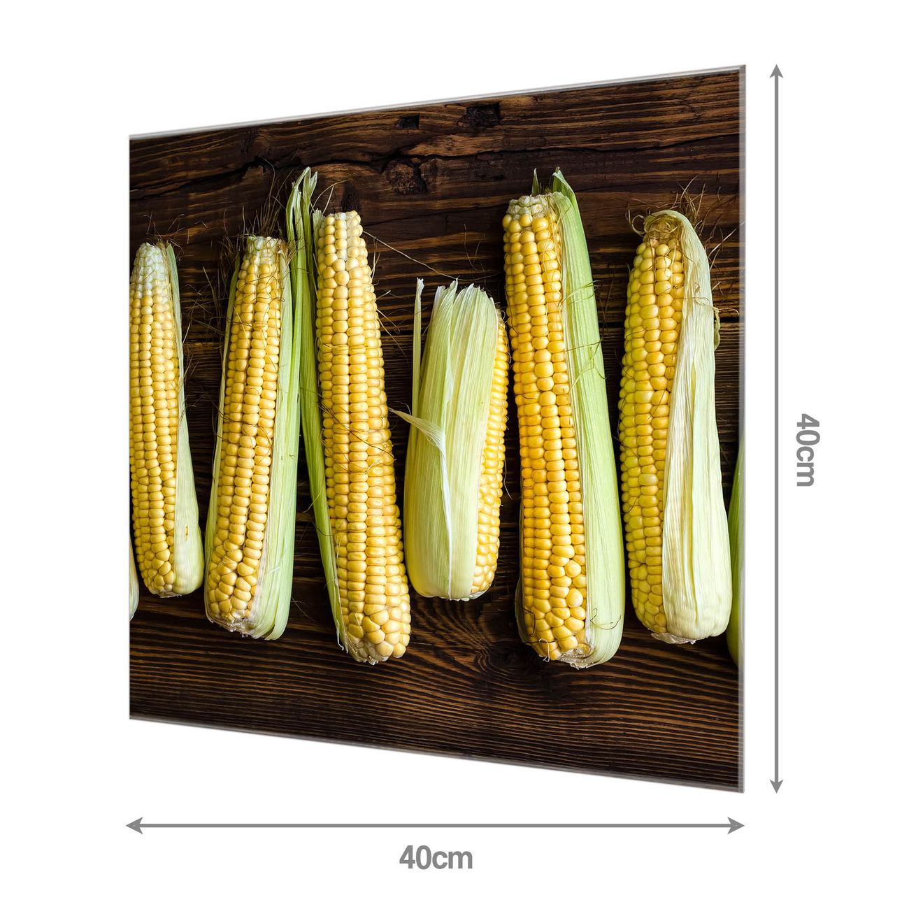 Material: 4mm Sicherheitsglas mit Metallrückwand Eigenschaften: beschreibbar, magnetisch, kratzfest Maße: 40x40x0,6cm, 3,36 kg schwer Motiv Nummer 12703 Maiskolben Zubehör: inklusive 4 Neodym-Magnete