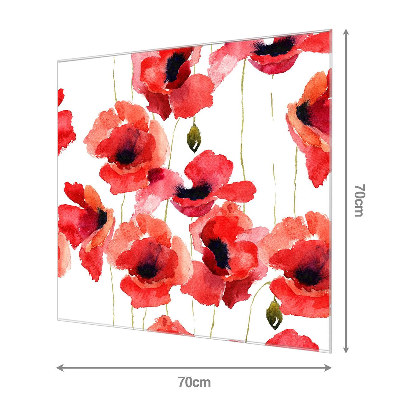 Material: 4mm Sicherheitsglas mit Metallrückwand Eigenschaften: beschreibbar, magnetisch, kratzfest Maße: 70x70x0,6cm, 10,50 kg schwer Motiv Nummer 12326 Mohn Aquarell Zubehör: inklusive 4 Neodym-Magnete