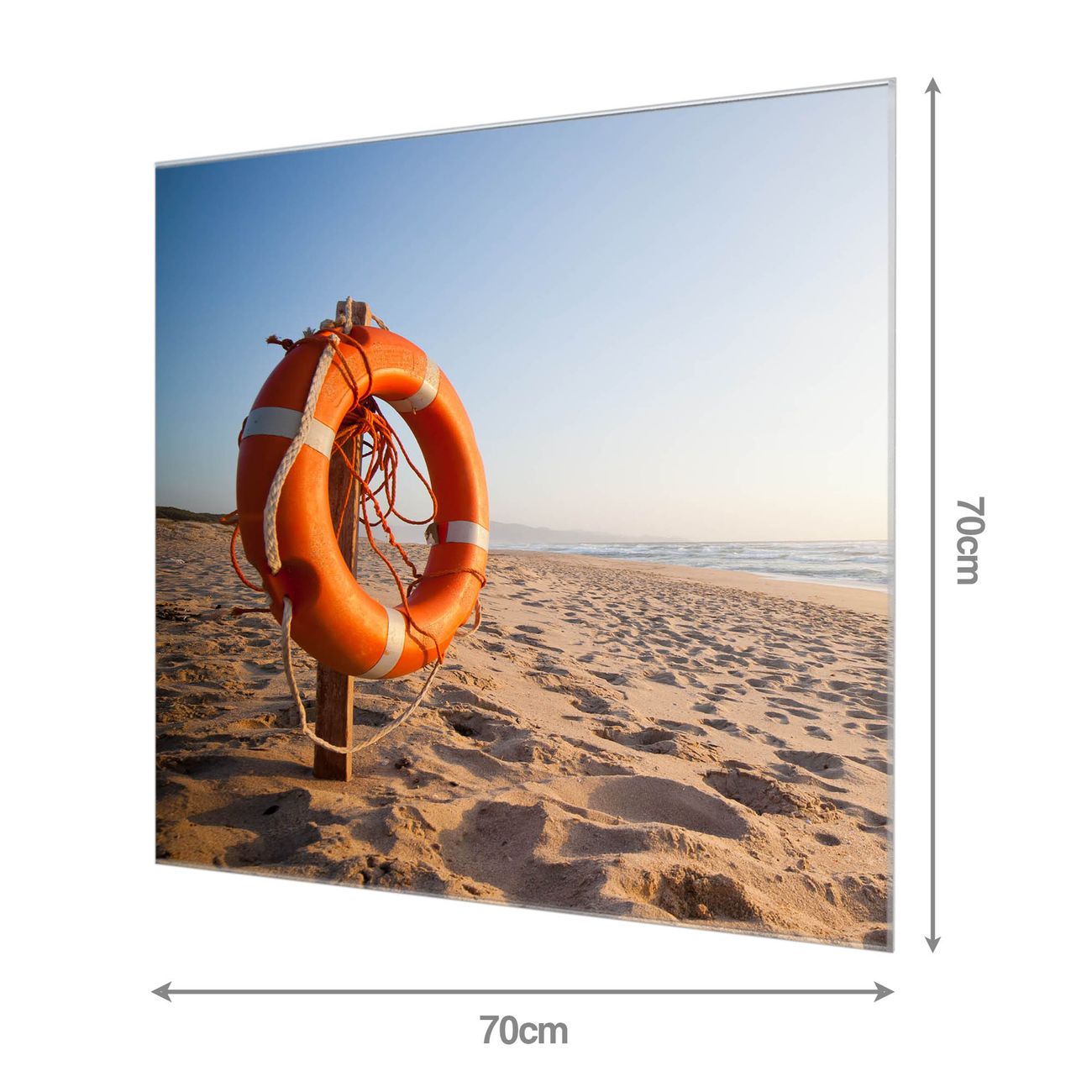 Material: 4mm Sicherheitsglas mit Metallrückwand Eigenschaften: beschreibbar, magnetisch, kratzfest Maße: 70x70x0,6cm, 10,50 kg schwer Motiv Nummer 12337 Morgens Am Strand Zubehör: inklusive 4 Neodym-Magnete