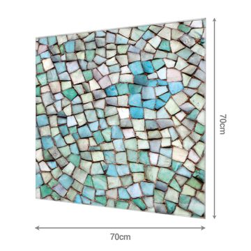 Material: 4mm Sicherheitsglas mit Metallrückwand Eigenschaften: beschreibbar, magnetisch, kratzfest Maße: 70x70x0,6cm, 10,50 kg schwer Motiv Nummer 11541 Mosaik Blau Zubehör: inklusive 4 Neodym-Magnete