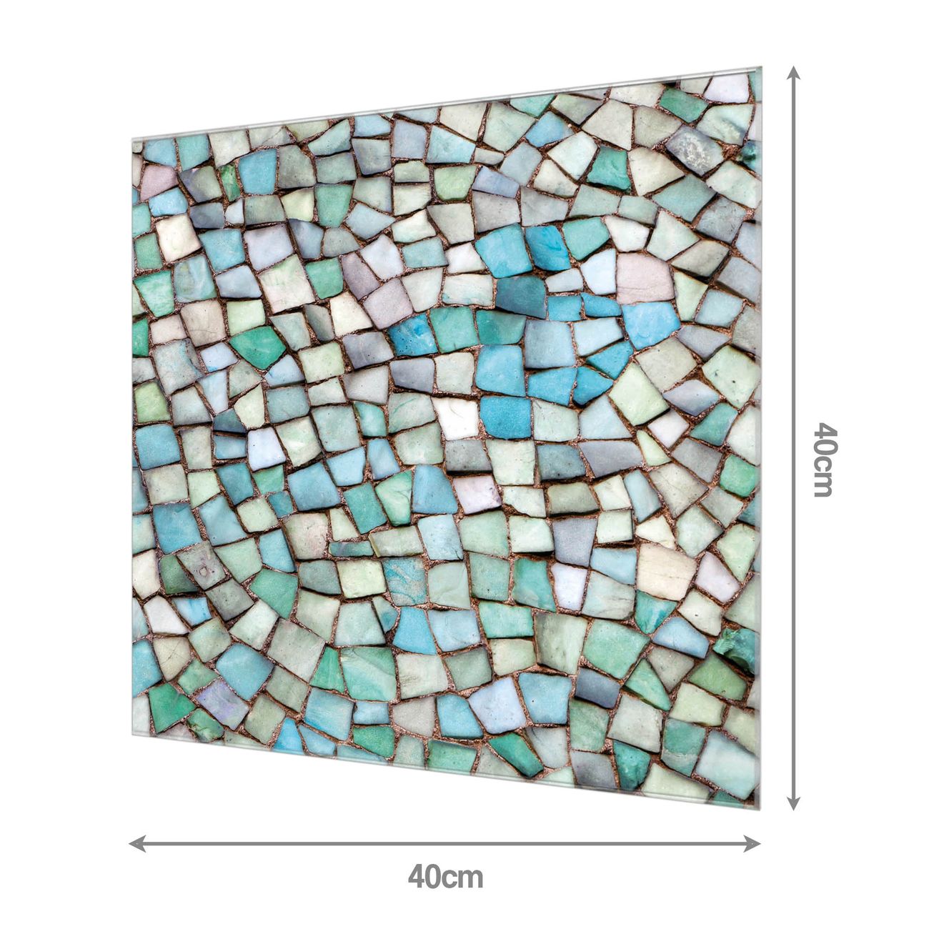 Material: 4mm Sicherheitsglas mit Metallrückwand Eigenschaften: beschreibbar, magnetisch, kratzfest Maße: 40x40x0,6cm, 3,36 kg schwer Motiv Nummer 11541 Mosaik Blau Zubehör: inklusive 4 Neodym-Magnete