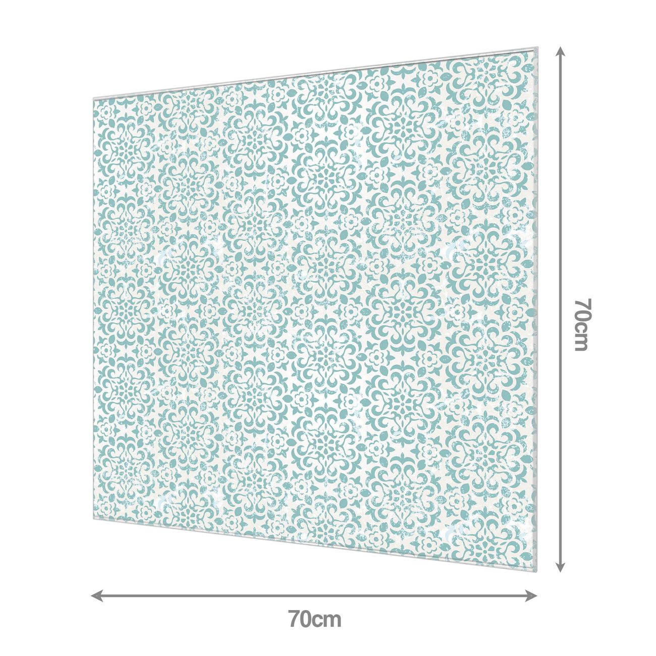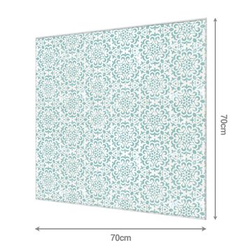 Material: 4mm Sicherheitsglas mit Metallrückwand Eigenschaften: beschreibbar, magnetisch, kratzfest Maße: 70x70x0,6cm, 10,50 kg schwer Motiv Nummer 10947 Muster Getupft Blau Zubehör: inklusive 4 Neodym-Magnete