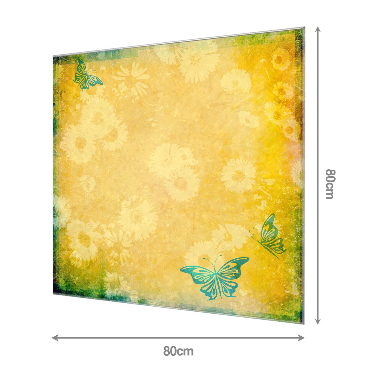 Material: 4mm Sicherheitsglas mit Metallrückwand Eigenschaften: beschreibbar, magnetisch, kratzfest Maße: 80x80x0,6cm, 12,00 kg schwer Motiv Nummer 10365 Muster Sommer Zubehör: inklusive 4 Neodym-Magnete