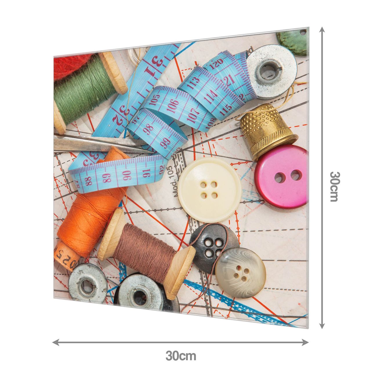 Material: 4mm Sicherheitsglas mit Metallrückwand Eigenschaften: beschreibbar, magnetisch, kratzfest Maße: 30x30x0,6cm, 1,89 kg schwer Motiv Nummer 10569 Nähen Zubehör: inklusive 4 Neodym-Magnete