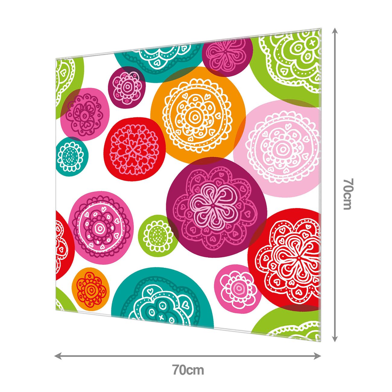 Material: 4mm Sicherheitsglas mit Metallrückwand Eigenschaften: beschreibbar, magnetisch, kratzfest Maße: 70x70x0,6cm, 10,50 kg schwer Motiv Nummer 11419 Naive Blüten Zubehör: inklusive 4 Neodym-Magnete