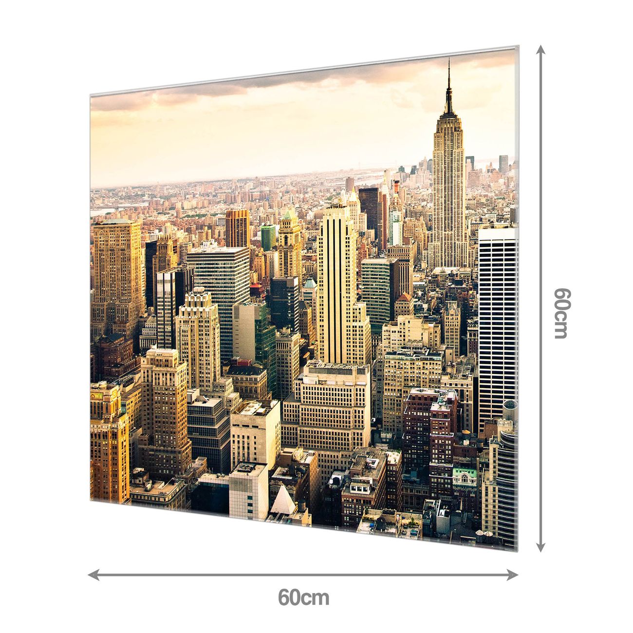Material: 4mm Sicherheitsglas mit Metallrückwand Eigenschaften: beschreibbar, magnetisch, kratzfest Maße: 60x60x0,6cm, 7,56 kg schwer Motiv Nummer 10238 New York City Zubehör: inklusive 4 Neodym-Magnete