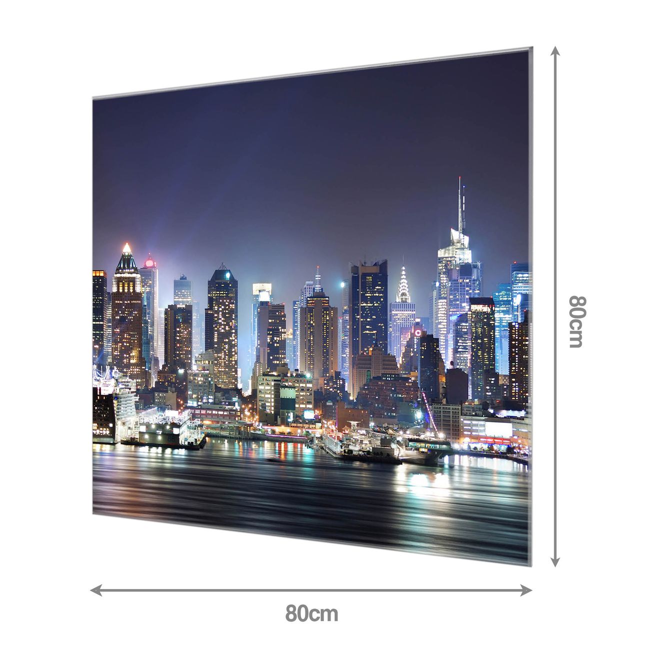 Material: 4mm Sicherheitsglas mit Metallrückwand Eigenschaften: beschreibbar, magnetisch, kratzfest Maße: 80x80x0,6cm, 12,00 kg schwer Motiv Nummer 10019 New York Zubehör: inklusive 4 Neodym-Magnete