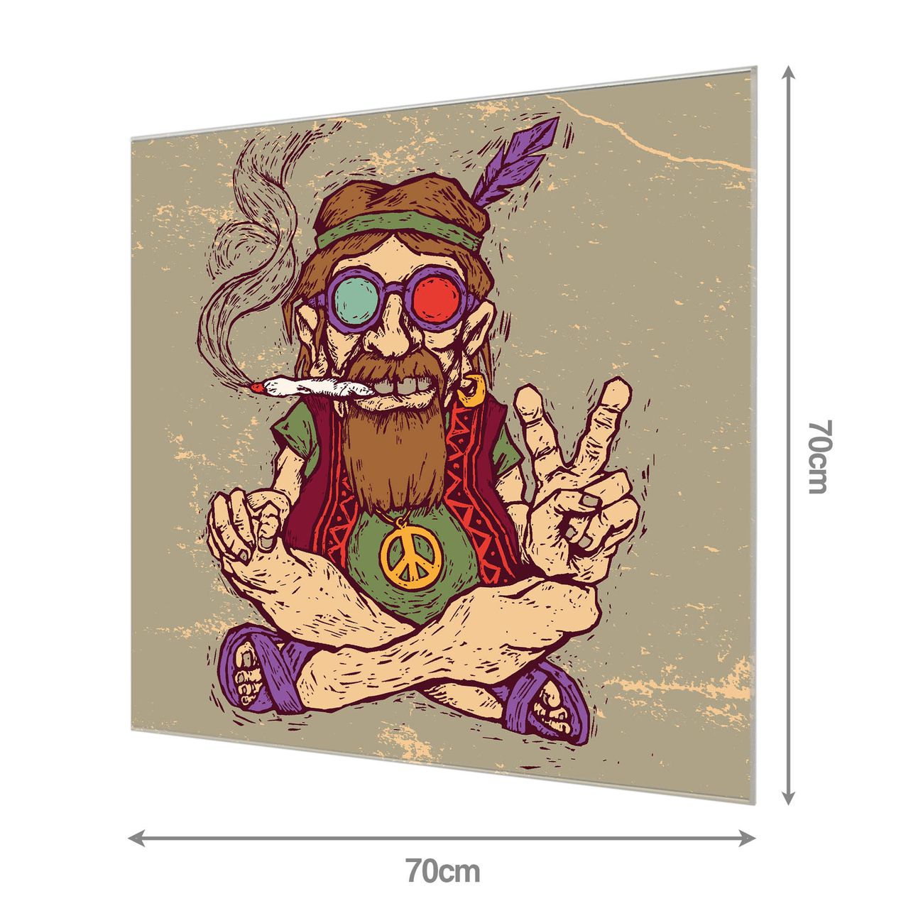 Material: 4mm Sicherheitsglas mit Metallrückwand Eigenschaften: beschreibbar, magnetisch, kratzfest Maße: 70x70x0,6cm, 10,50 kg schwer Motiv Nummer 12068 Peace Zubehör: inklusive 4 Neodym-Magnete