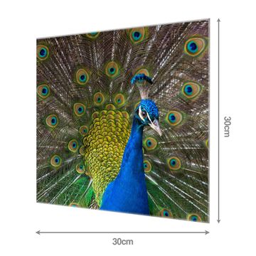Material: 4mm Sicherheitsglas mit Metallrückwand Eigenschaften: beschreibbar, magnetisch, kratzfest Maße: 30x30x0,6cm, 1,89 kg schwer Motiv Nummer 10500 Pfau Zubehör: inklusive 4 Neodym-Magnete