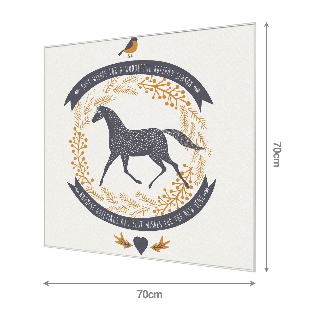 Material: 4mm Sicherheitsglas mit Metallrückwand Eigenschaften: beschreibbar, magnetisch, kratzfest Maße: 70x70x0,6cm, 10,50 kg schwer Motiv Nummer 12646 Pferd und Vogel Zubehör: inklusive 4 Neodym-Magnete