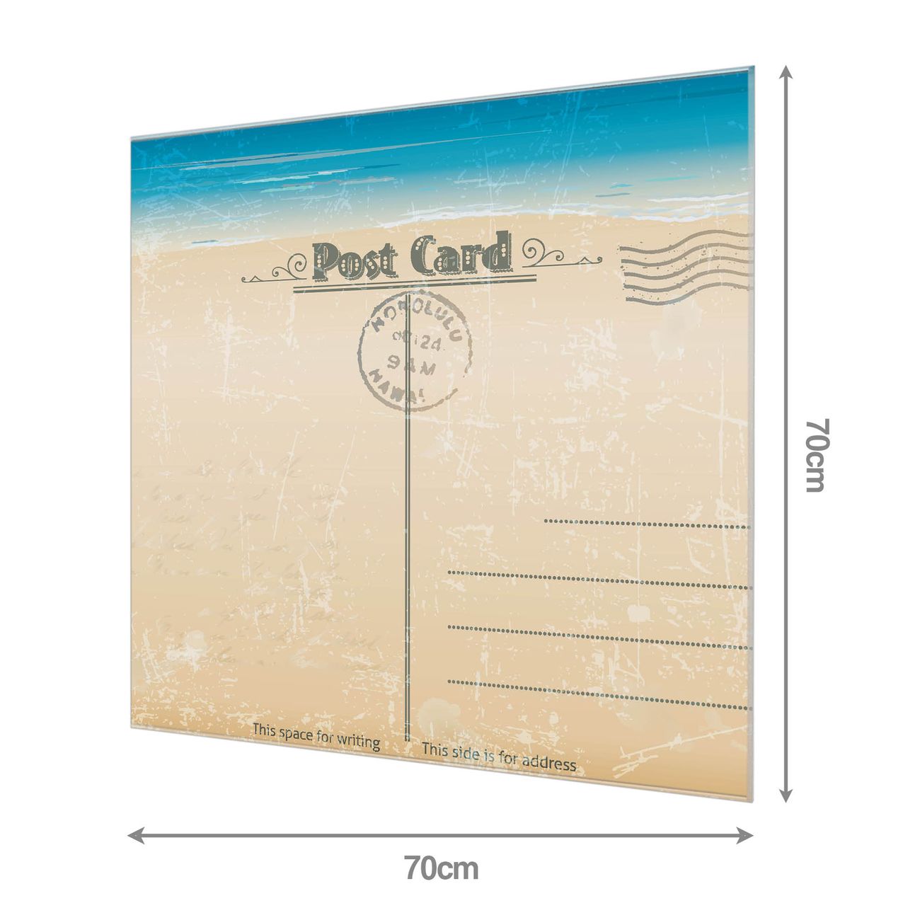 Material: 4mm Sicherheitsglas mit Metallrückwand Eigenschaften: beschreibbar, magnetisch, kratzfest Maße: 70x70x0,6cm, 10,50 kg schwer Motiv Nummer 10316 Postkarte Zubehör: inklusive 4 Neodym-Magnete