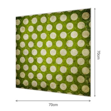 Material: 4mm Sicherheitsglas mit Metallrückwand Eigenschaften: beschreibbar, magnetisch, kratzfest Maße: 70x70x0,6cm, 10,50 kg schwer Motiv Nummer 11267 Punkte Grün Vintage Zubehör: inklusive 4 Neodym-Magnete