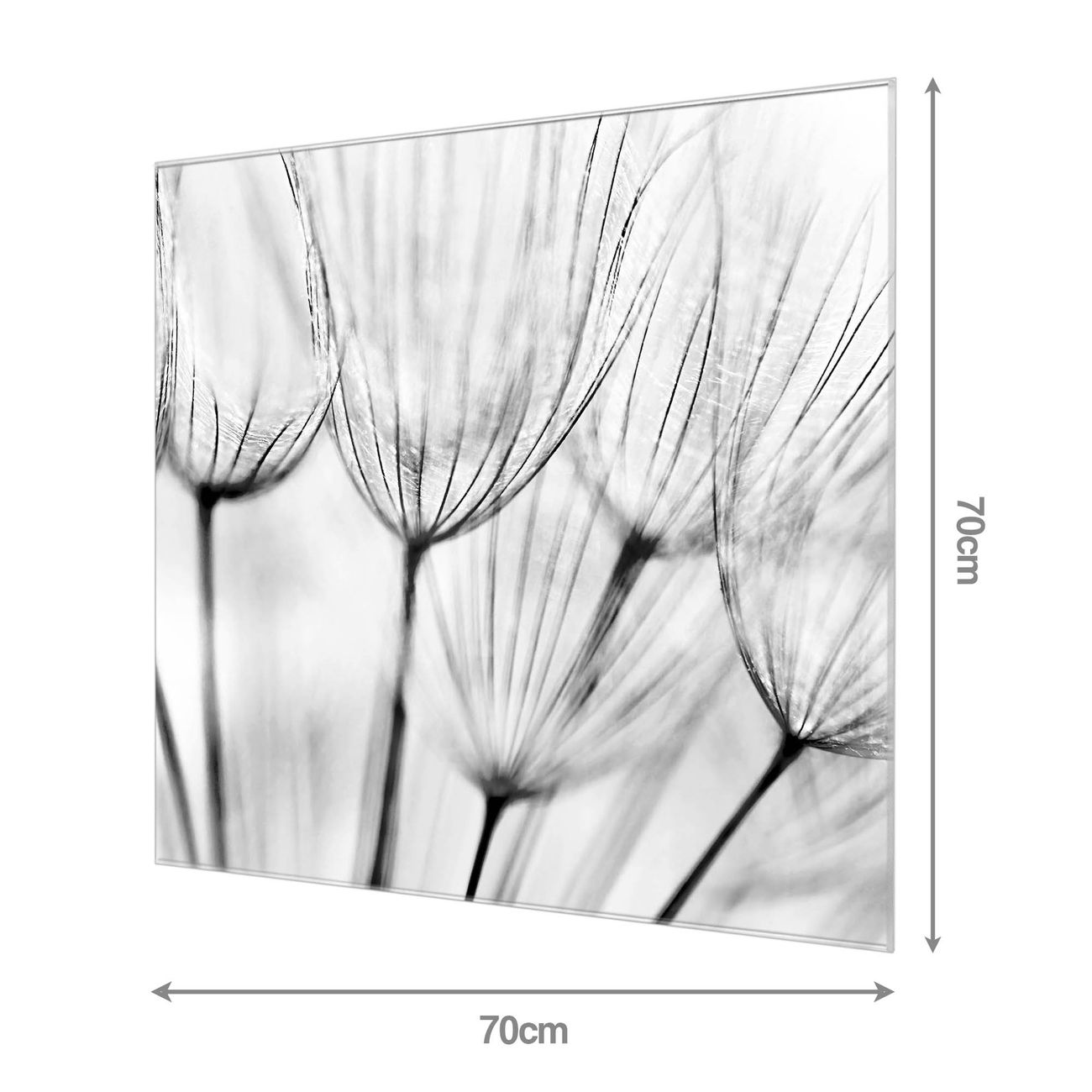 Material: 4mm Sicherheitsglas mit Metallrückwand Eigenschaften: beschreibbar, magnetisch, kratzfest Maße: 70x70x0,6cm, 10,50 kg schwer Motiv Nummer 11485 Pusteblumen SW Zubehör: inklusive 4 Neodym-Magnete