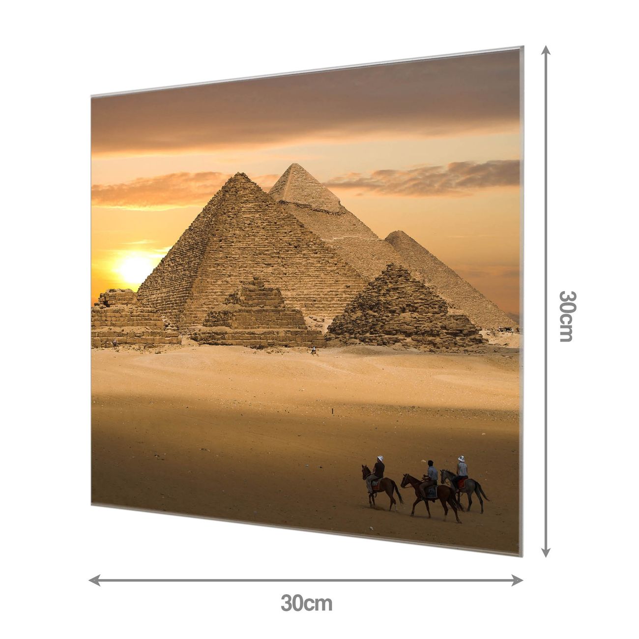 Material: 4mm Sicherheitsglas mit Metallrückwand Eigenschaften: beschreibbar, magnetisch, kratzfest Maße: 30x30x0,6cm, 1,89 kg schwer Motiv Nummer 10167 Pyramiden Zubehör: inklusive 4 Neodym-Magnete