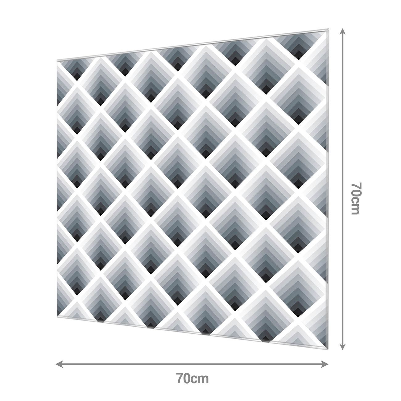 Material: 4mm Sicherheitsglas mit Metallrückwand Eigenschaften: beschreibbar, magnetisch, kratzfest Maße: 70x70x0,6cm, 10,50 kg schwer Motiv Nummer 11937 Raster 3D Grau Zubehör: inklusive 4 Neodym-Magnete
