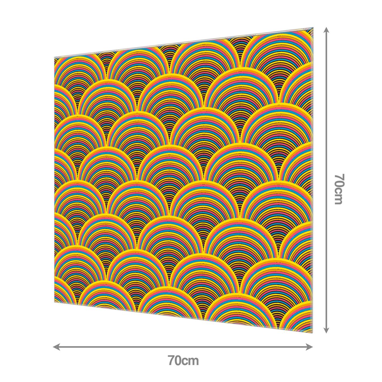 Material: 4mm Sicherheitsglas mit Metallrückwand Eigenschaften: beschreibbar, magnetisch, kratzfest Maße: 70x70x0,6cm, 10,50 kg schwer Motiv Nummer 12018 Regenbögen Zubehör: inklusive 4 Neodym-Magnete