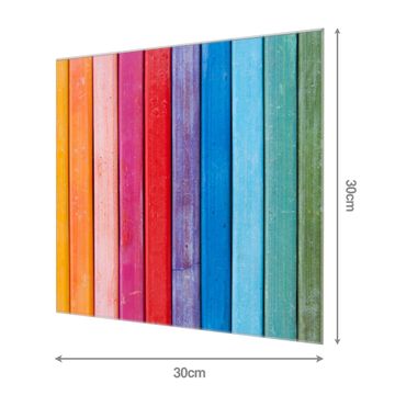 Material: 4mm Sicherheitsglas mit Metallrückwand Eigenschaften: beschreibbar, magnetisch, kratzfest Maße: 30x30x0,6cm, 1,89 kg schwer Motiv Nummer 12175 Regenbogenfarben Zubehör: inklusive 4 Neodym-Magnete