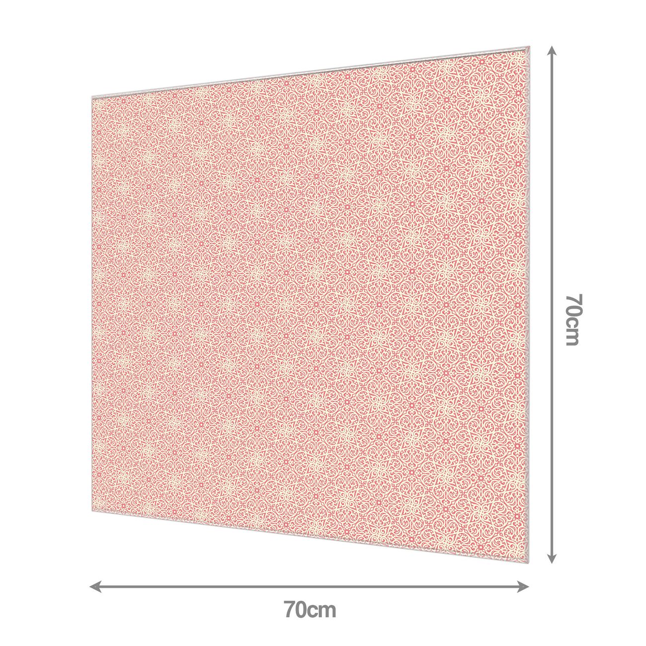 Material: 4mm Sicherheitsglas mit Metallrückwand Eigenschaften: beschreibbar, magnetisch, kratzfest Maße: 70x70x0,6cm, 10,50 kg schwer Motiv Nummer 11446 Rosa Arabesque Zubehör: inklusive 4 Neodym-Magnete