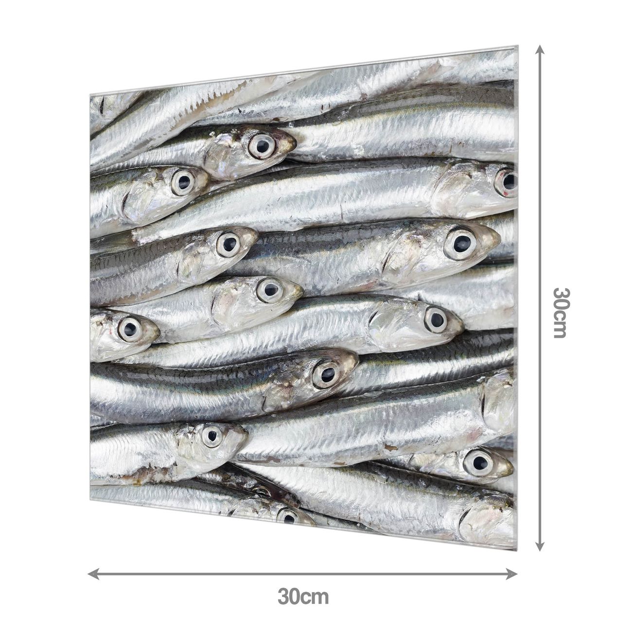 Material: 4mm Sicherheitsglas mit Metallrückwand Eigenschaften: beschreibbar, magnetisch, kratzfest Maße: 30x30x0,6cm, 1,89 kg schwer Motiv Nummer 10458 Sardinen Zubehör: inklusive 4 Neodym-Magnete