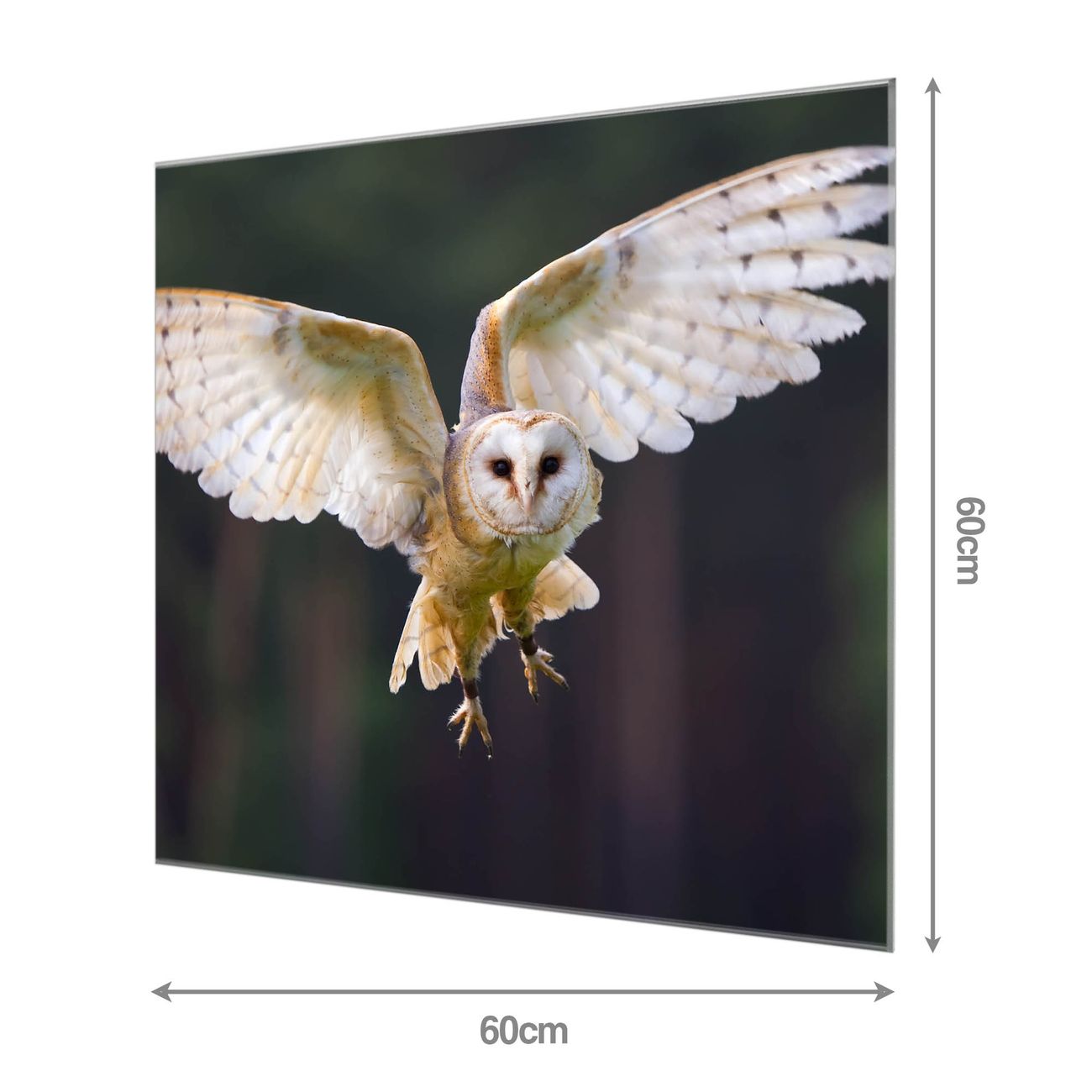 Material: 4mm Sicherheitsglas mit Metallrückwand Eigenschaften: beschreibbar, magnetisch, kratzfest Maße: 60x60x0,6cm, 7,56 kg schwer Motiv Nummer 10503 Schleiereule Zubehör: inklusive 4 Neodym-Magnete