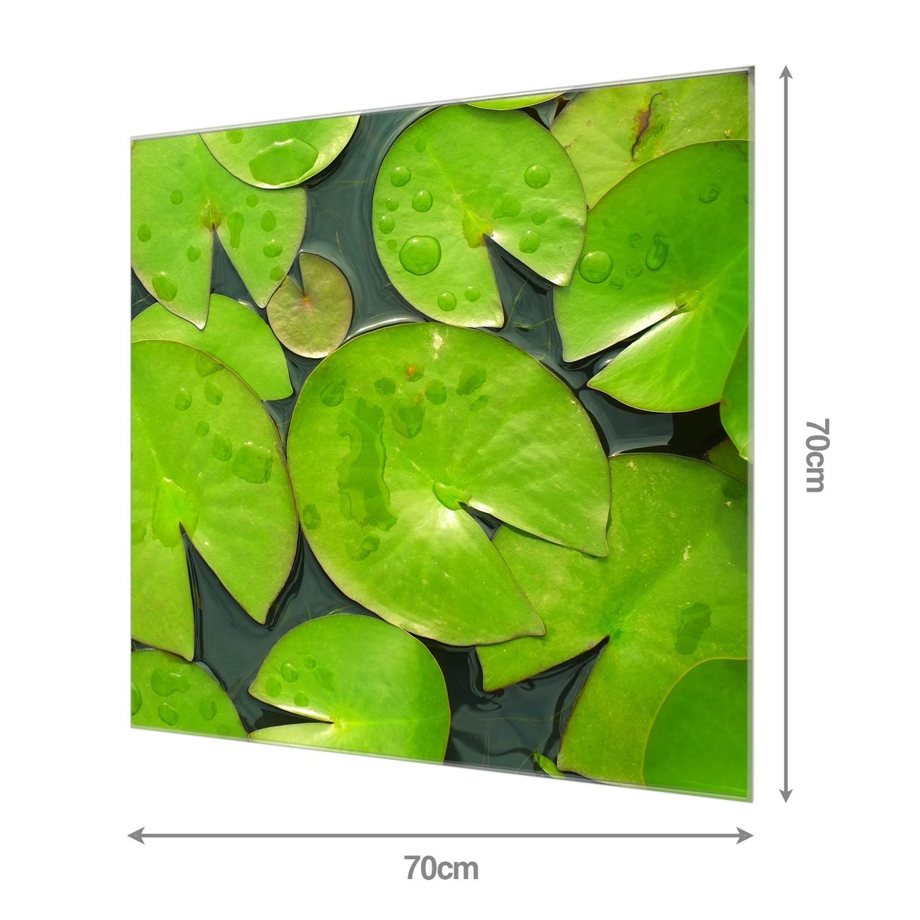 Material: 4mm Sicherheitsglas mit Metallrückwand Eigenschaften: beschreibbar, magnetisch, kratzfest Maße: 70x70x0,6cm, 10,50 kg schwer Motiv Nummer 12552 Seerosenblätter Zubehör: inklusive 4 Neodym-Magnete