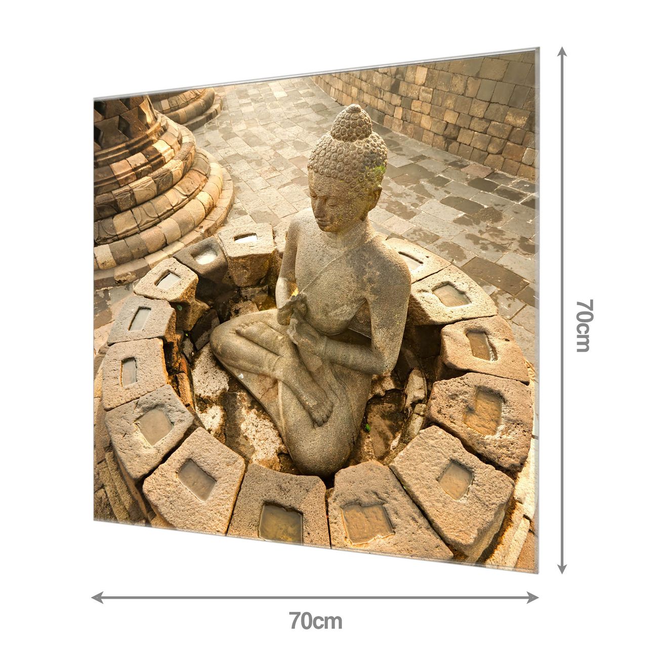 Material: 4mm Sicherheitsglas mit Metallrückwand Eigenschaften: beschreibbar, magnetisch, kratzfest Maße: 70x70x0,6cm, 10,50 kg schwer Motiv Nummer 11260 Sitzender Buddha Zubehör: inklusive 4 Neodym-Magnete