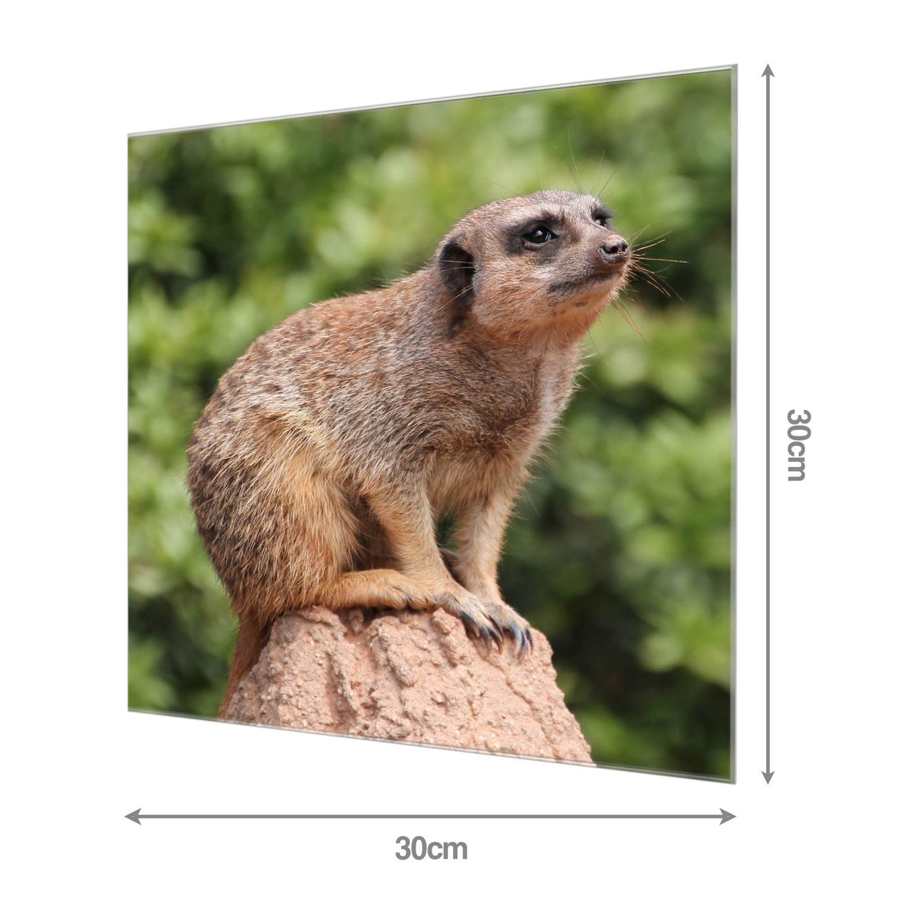 Material: 4mm Sicherheitsglas mit Metallrückwand Eigenschaften: beschreibbar, magnetisch, kratzfest Maße: 30x30x0,6cm, 1,89 kg schwer Motiv Nummer 10284 Sitzendes Erdmännchen Zubehör: inklusive 4 Neodym-Magnete