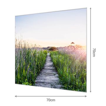 Material: 4mm Sicherheitsglas mit Metallrückwand Eigenschaften: beschreibbar, magnetisch, kratzfest Maße: 70x70x0,6cm, 10,50 kg schwer Motiv Nummer 12289 Steg Durchs Schilf Zubehör: inklusive 4 Neodym-Magnete