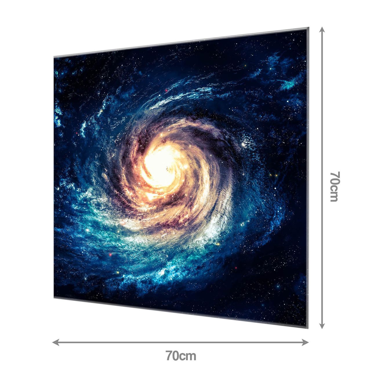 Material: 4mm Sicherheitsglas mit Metallrückwand Eigenschaften: beschreibbar, magnetisch, kratzfest Maße: 70x70x0,6cm, 10,50 kg schwer Motiv Nummer 10459 Sternenwirbel Zubehör: inklusive 4 Neodym-Magnete