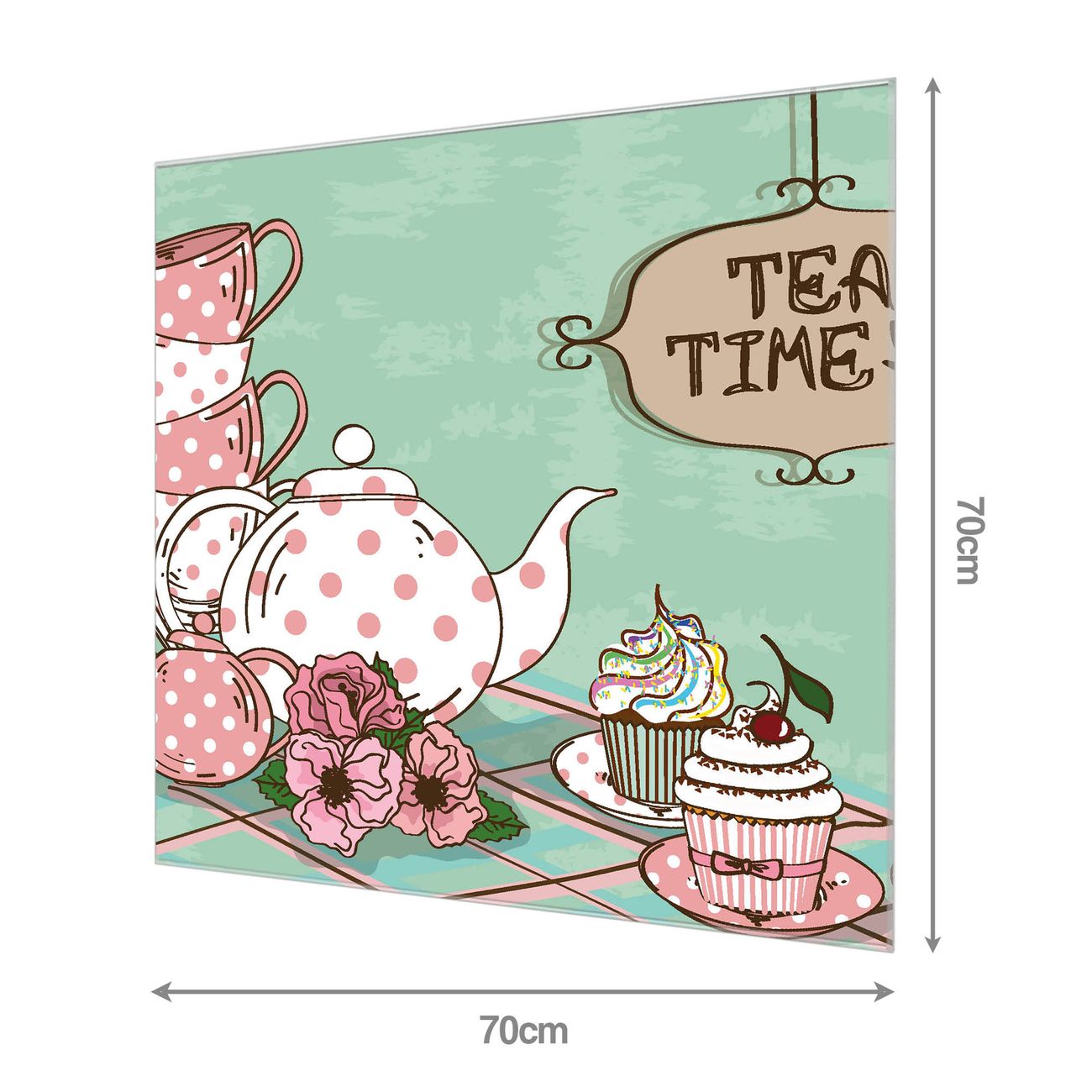 Material: 4mm Sicherheitsglas mit Metallrückwand Eigenschaften: beschreibbar, magnetisch, kratzfest Maße: 70x70x0,6cm, 10,50 kg schwer Motiv Nummer 12121 Tea Time Zubehör: inklusive 4 Neodym-Magnete